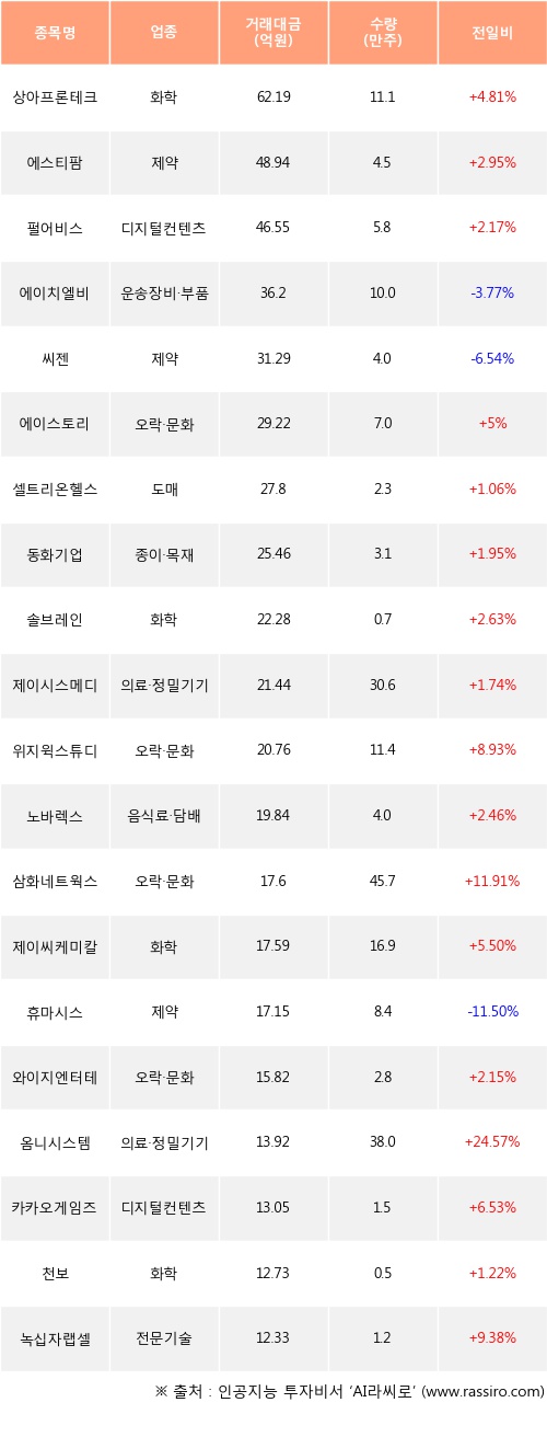 기관 투자자의 순매수 상위 20개 종목은 상아프론테크, 에스티팜, 펄어비스, 에이치엘비, 씨젠, 에이스토리, 셀트리온헬스케어, 동화기업, 솔브레인, 제이시스메디칼등이다.