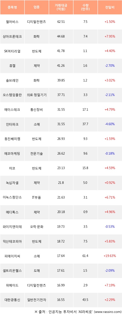 기관 투자자의 순매수 상위 20개 종목은 펄어비스, 상아프론테크, SK머티리얼즈, 휴젤, 솔브레인, 오스템임플란트, 에이스테크, 인터파크, 동진쎄미켐, 에코마케팅등이다.
