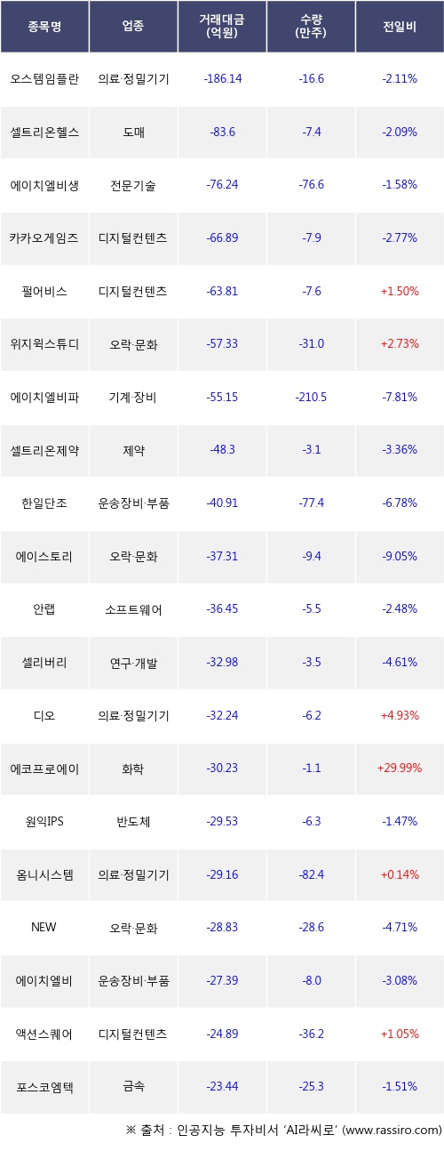외국인 투자자의 순매도 상위 20개 종목은 오스템임플란트, 셀트리온헬스케어, 에이치엘비생명과학, 카카오게임즈, 펄어비스, 위지윅스튜디오, 에이치엘비파워, 셀트리온제약, 한일단조, 에이스토리등이다.