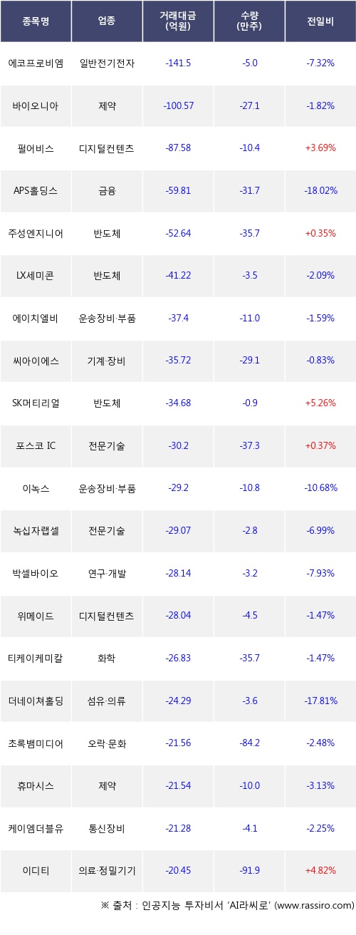 외국인 투자자의 순매도 상위 20개 종목은 에코프로비엠, 바이오니아, 펄어비스, APS홀딩스, 주성엔지니어링, LX세미콘, 에이치엘비, 씨아이에스, SK머티리얼즈, 포스코 ICT등이다.