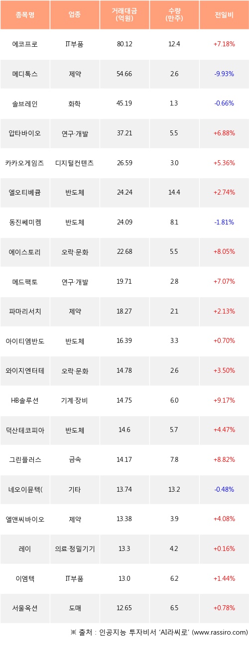 에코프로, 압타바이오, 카카오게임즈 등은 전일 대비 주가가 상승했고, 메디톡스, 솔브레인, 동진쎄미켐 등은 주가가 하락했다.