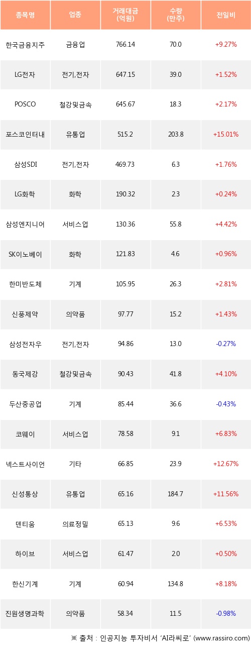 외국인 투자자의 순매수 상위 20개 종목은 한국금융지주, LG전자, POSCO, 포스코인터내셔널, 삼성SDI, LG화학, 삼성엔지니어링, SK이노베이션, 한미반도체, 신풍제약등이다.