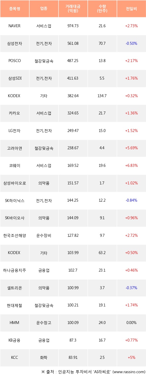 NAVER, POSCO, 삼성SDI 등은 전일 대비 주가가 상승했고, 삼성전자, SK하이닉스, 셀트리온 등은 주가가 하락했다.