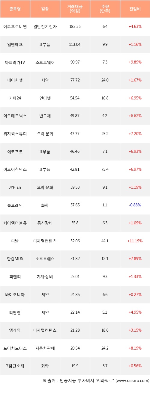 에코프로비엠, 엘앤에프, 아프리카TV 등은 전일 대비 주가가 상승했고, 솔브레인 등은 주가가 하락했다.