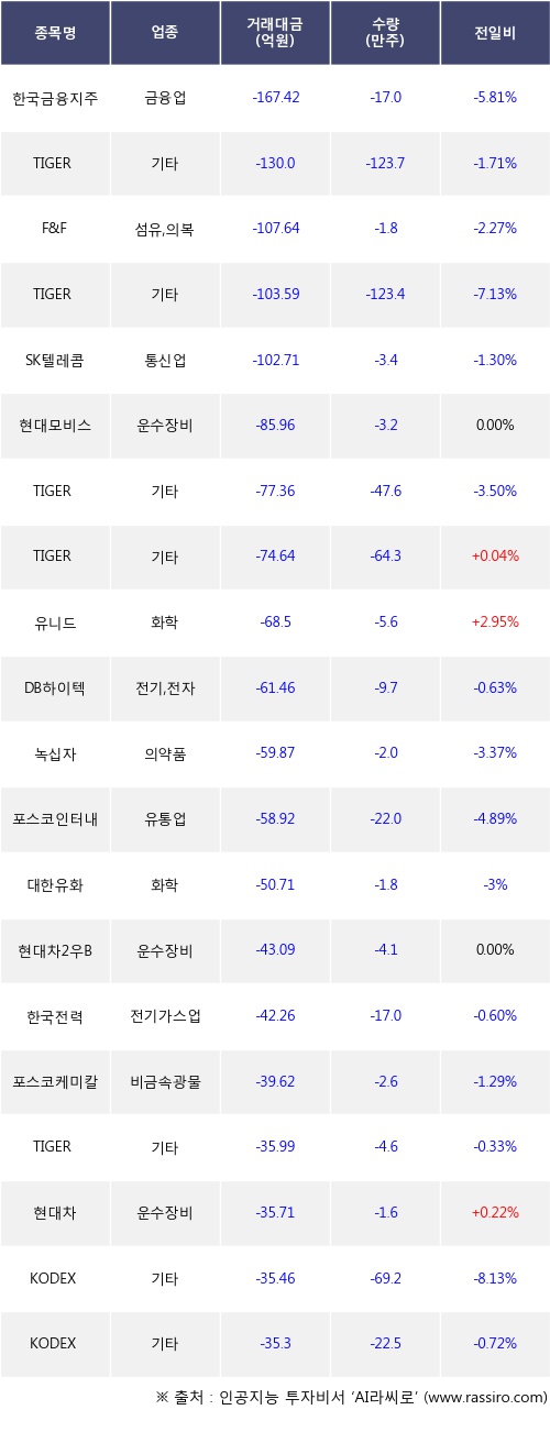 기관 투자자의 순매도 상위 20개 종목은 한국금융지주, TIGER 글로벌리튬&2차전지SOLACTIVE(합성), F&F, TIGER 차이나항셍테크, SK텔레콤, 현대모비스, TIGER 차이나전기차SOLACTIVE, TIGER 미국테크TOP10 INDXX, 유니드, DB하이텍등이다.