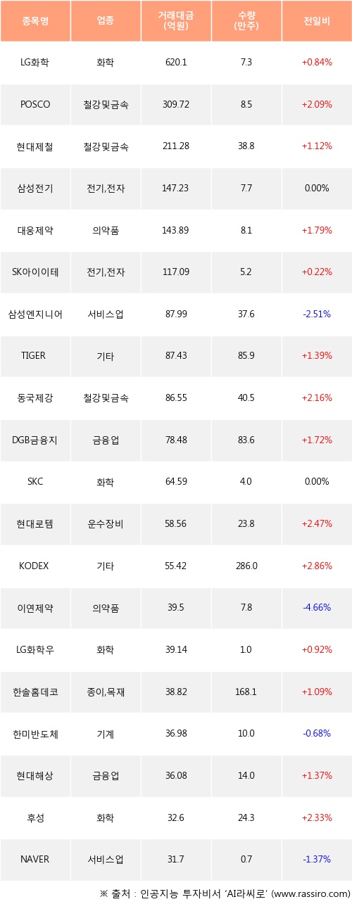 LG화학, POSCO, 현대제철 등은 전일 대비 주가가 상승했고, 삼성엔지니어링, 이연제약, 한미반도체 등은 주가가 하락했다.