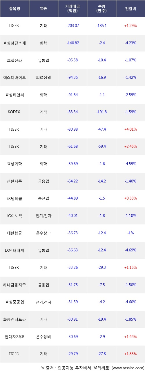 기관 투자자의 순매도 상위 20개 종목은 TIGER 글로벌리튬&2차전지SOLACTIVE(합성), 효성첨단소재, 호텔신라, 에스디바이오센서, 효성티앤씨, KODEX 코스닥150선물인버스, TIGER 차이나전기차SOLACTIVE, TIGER 미국필라델피아반도체나스닥, 효성화학, 신한지주등이다.