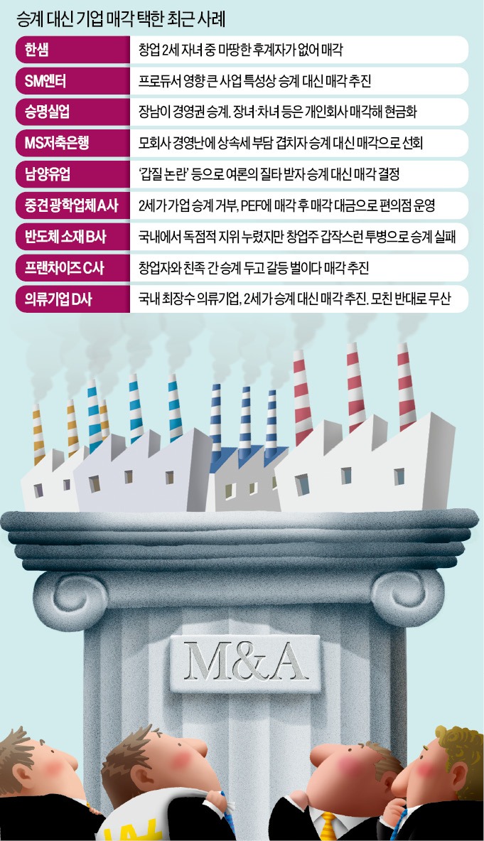 과거와 달리 창업주들 사이에 ‘능력 없는 자녀’에겐 물려주지 않는다는 인식도 확산됐다. 중견 제조업체 A사의 사장은 아들의 경영능력이 기대에 못 미치자 어쩔 수 없이 회사를 팔았다. 70대 창업주가 일군 B사는 50대 자녀들의 승계 다툼이 심해지자 돌연 매각으로 방향을 돌리기도 했다.