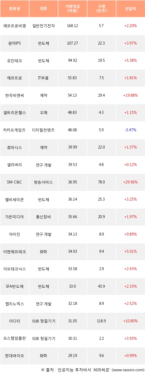 에코프로비엠, 원익IPS, 유진테크 등은 전일 대비 주가가 상승했고, 카카오게임즈 등은 주가가 하락했다.