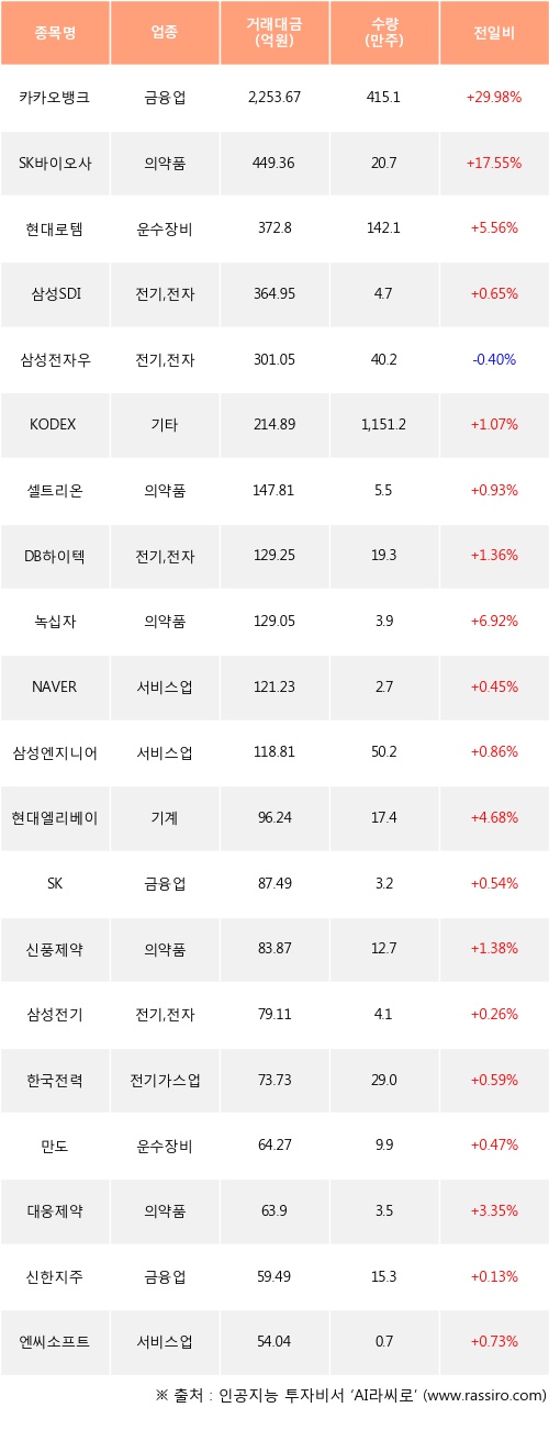 카카오뱅크, SK바이오사이언스, 현대로템 등은 전일 대비 주가가 상승했고, 삼성전자우 등은 주가가 하락했다.