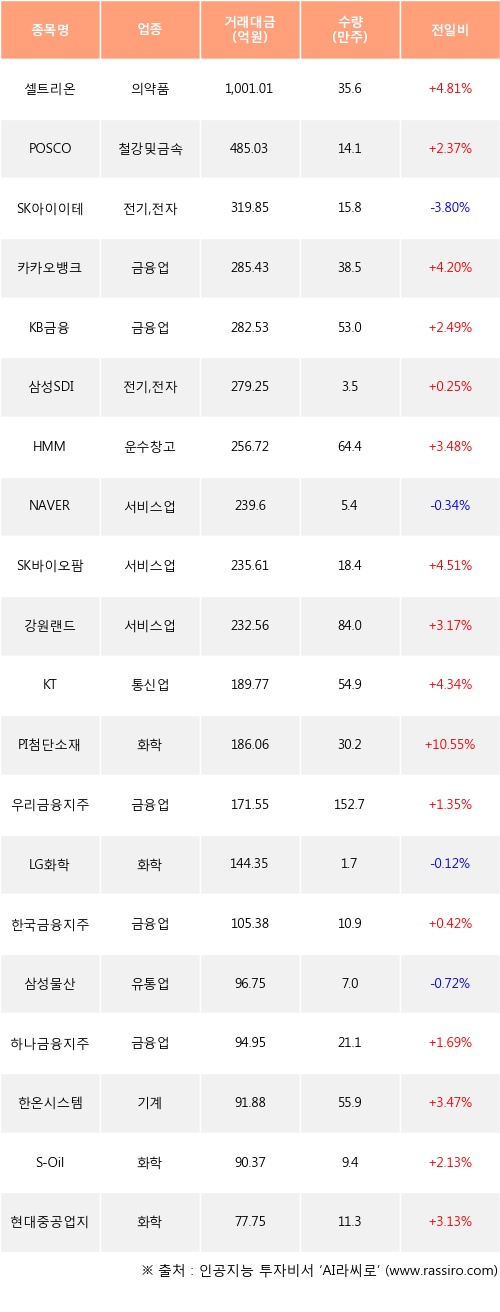 외국인 투자자의 순매수 상위 20개 종목은 셀트리온, POSCO, SK아이이테크놀로지, 카카오뱅크, KB금융, 삼성SDI, HMM, NAVER, SK바이오팜, 강원랜드등이다.