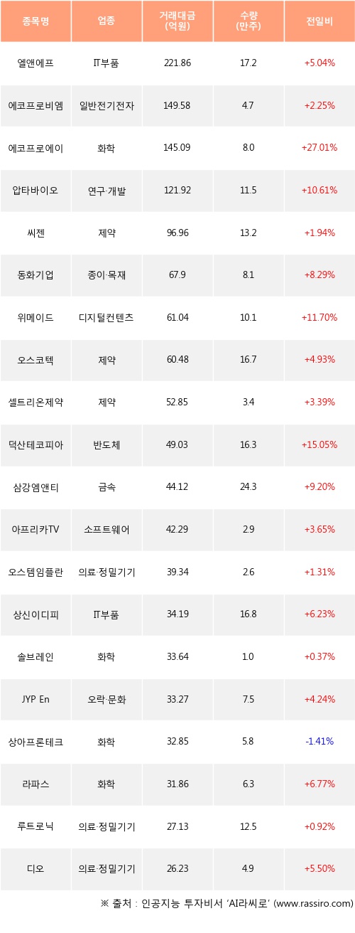 외국인 투자자의 순매수 상위 20개 종목은 엘앤에프, 에코프로비엠, 에코프로에이치엔, 압타바이오, 씨젠, 동화기업, 위메이드, 오스코텍, 셀트리온제약, 덕산테코피아등이다.