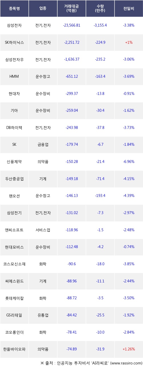 외국인 투자자의 순매도 상위 20개 종목은 삼성전자, SK하이닉스, 삼성전자우, HMM, 현대차, 기아, DB하이텍, SK, 신풍제약, 두산중공업등이다.