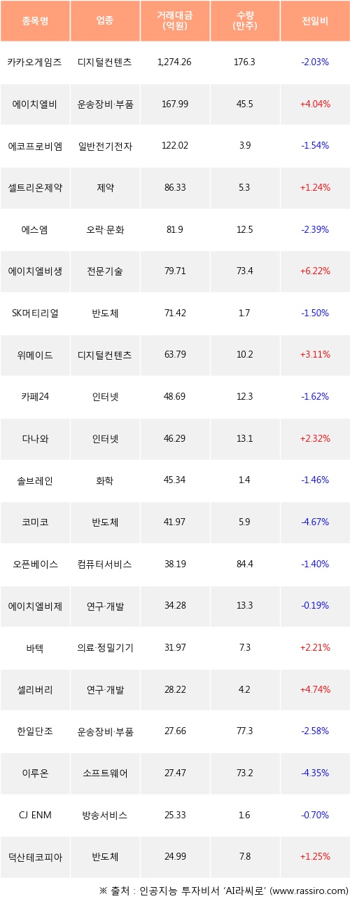 에이치엘비, 셀트리온제약, 에이치엘비생명과학 등은 전일 대비 주가가 상승했고, 카카오게임즈, 에코프로비엠, 에스엠 등은 주가가 하락했다.