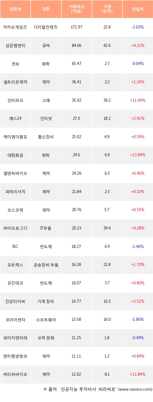 기관 투자자의 순매수 상위 20개 종목은 카카오게임즈, 삼강엠앤티, 천보, 셀트리온제약, 인터파크, 예스24, 케이엠더블유, 대정화금, 엘앤씨바이오, 파마리서치등이다.