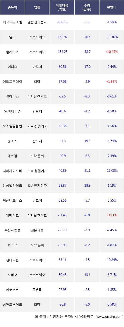기관 투자자의 순매도 상위 20개 종목은 에코프로비엠, 엠로, 플래티어, 네패스, 에코프로에이치엔, 펄어비스, SK머티리얼즈, 오스템임플란트, 월덱스, 에스엠등이다.