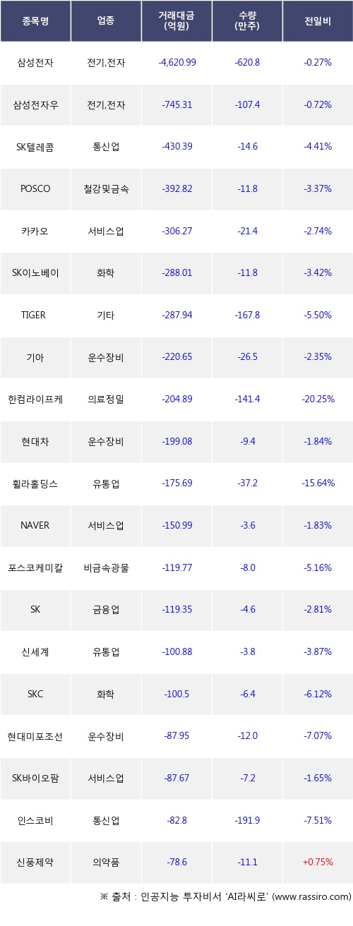 외국인 투자자의 순매도 상위 20개 종목은 삼성전자, 삼성전자우, SK텔레콤, POSCO, 카카오, SK이노베이션, TIGER 차이나전기차SOLACTIVE, 기아, 한컴라이프케어, 현대차등이다.