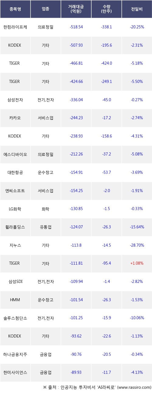 기관 투자자의 순매도 상위 20개 종목은 한컴라이프케어, KODEX 레버리지, TIGER 글로벌리튬&2차전지SOLACTIVE(합성), TIGER 차이나전기차SOLACTIVE, 삼성전자, 카카오, KODEX 코스닥150 레버리지, 에스디바이오센서, 대한항공, 엔씨소프트등이다.