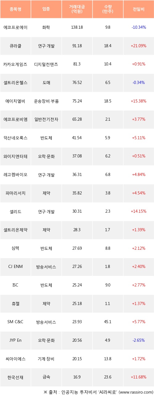 큐라클, 카카오게임즈, 에이치엘비 등은 전일 대비 주가가 상승했고, 에코프로에이치엔, 셀트리온헬스케어, JYP Ent. 등은 주가가 하락했다.