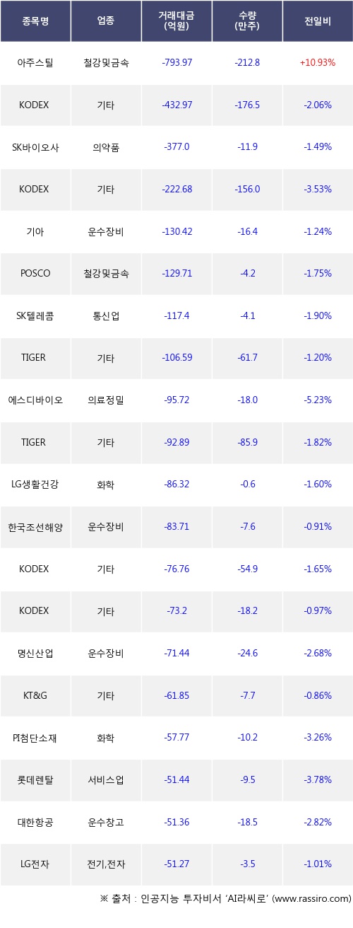 기관 투자자의 순매도 상위 20개 종목은 아주스틸, KODEX 레버리지, SK바이오사이언스, KODEX 코스닥150 레버리지, 기아, POSCO, SK텔레콤, TIGER 차이나전기차SOLACTIVE, 에스디바이오센서, TIGER 글로벌리튬&2차전지SOLACTIVE(합성)등이다.