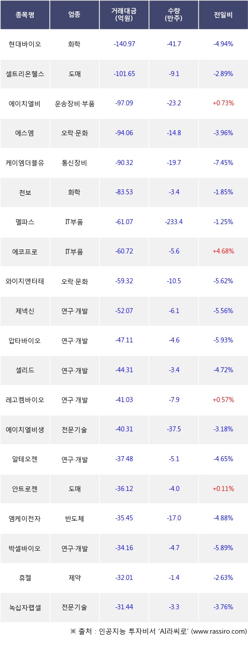 외국인 투자자의 순매도 상위 20개 종목은 현대바이오, 셀트리온헬스케어, 에이치엘비, 에스엠, 케이엠더블유, 천보, 멜파스, 에코프로, 와이지엔터테인먼트, 제넥신등이다.