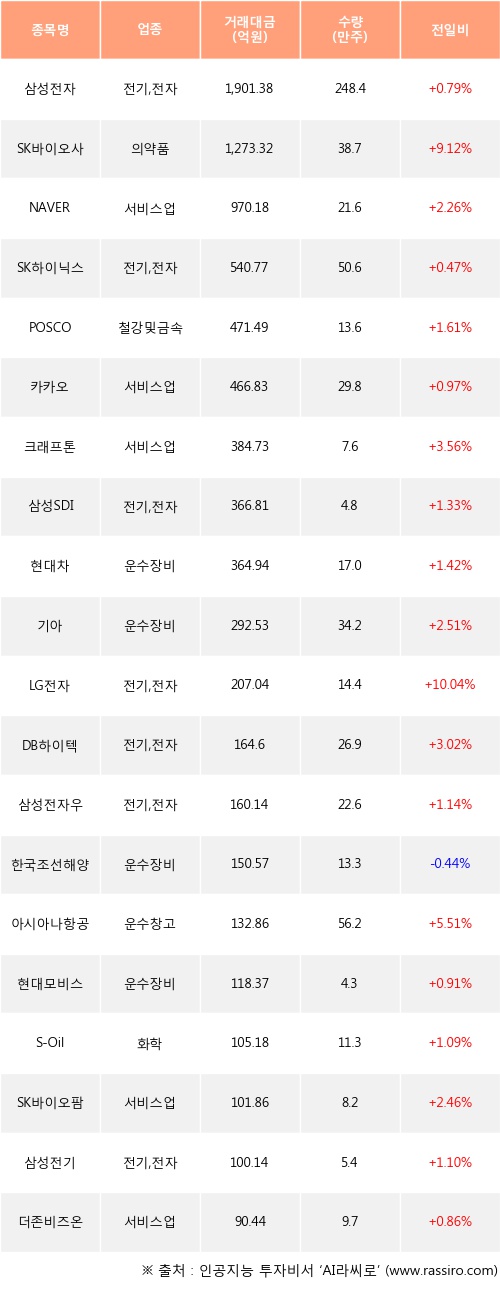삼성전자, SK바이오사이언스, NAVER 등은 전일 대비 주가가 상승했고, 한국조선해양 등은 주가가 하락했다.