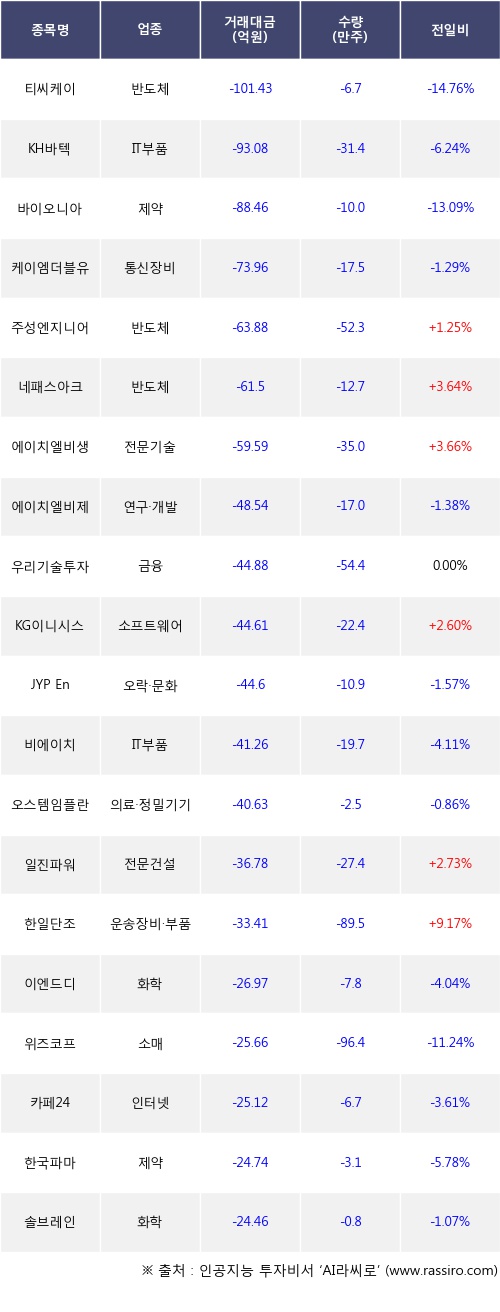 외국인 투자자의 순매도 상위 20개 종목은 티씨케이, KH바텍, 바이오니아, 케이엠더블유, 주성엔지니어링, 네패스아크, 에이치엘비생명과학, 에이치엘비제약, 우리기술투자, KG이니시스등이다.
