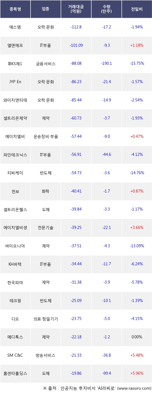 기관 투자자의 순매도 상위 20개 종목은 에스엠, 엘앤에프, IBKS제16호스팩, JYP Ent., 와이지엔터테인먼트, 셀트리온제약, 에이치엘비, 파인테크닉스, 티씨케이, 천보등이다.
