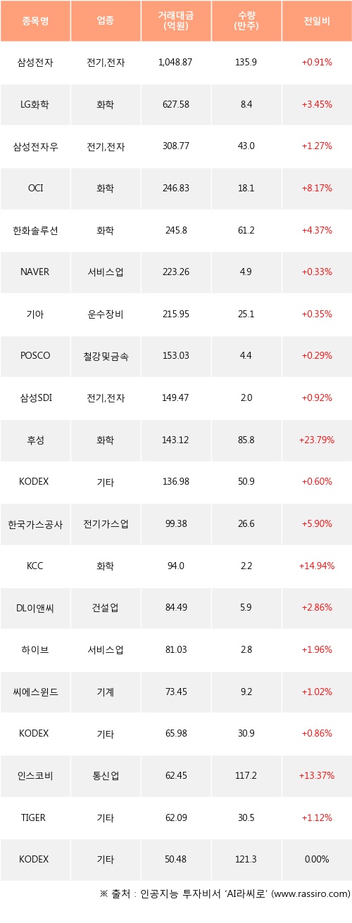외국인 투자자의 순매수 상위 20개 종목은 삼성전자, LG화학, 삼성전자우, OCI, 한화솔루션, NAVER, 기아, POSCO, 삼성SDI, 후성등이다.