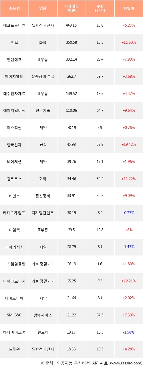 에코프로비엠, 천보, 엘앤에프 등은 전일 대비 주가가 상승했고, 카카오게임즈, 파마리서치, 하나마이크론 등은 주가가 하락했다.