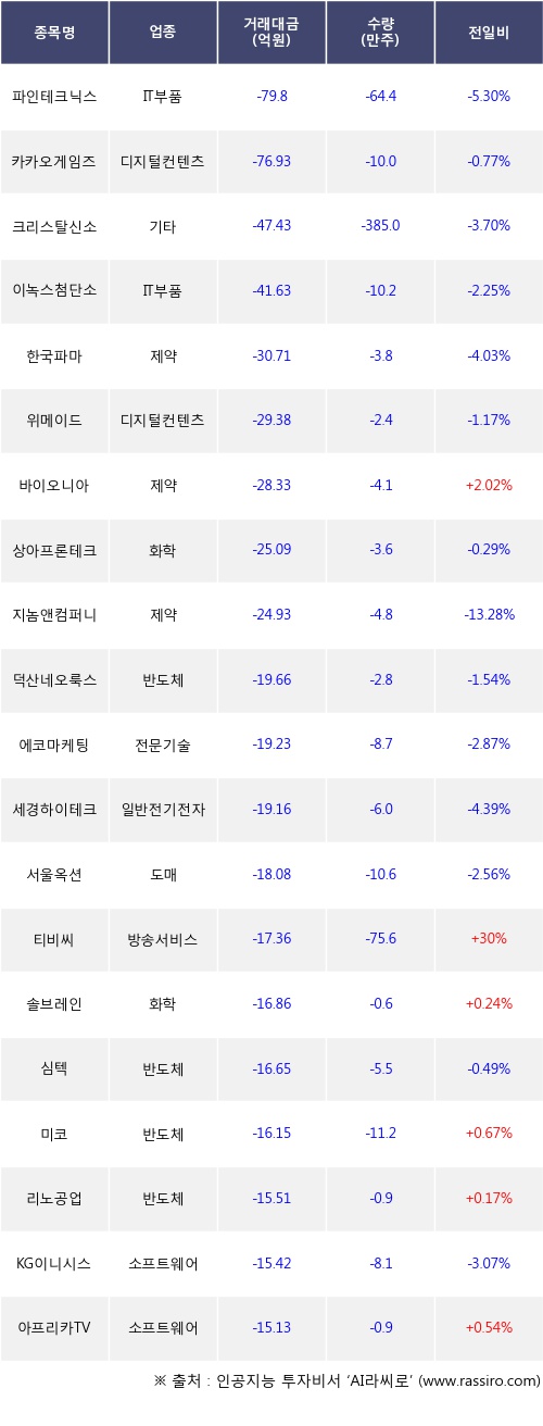 기관 투자자의 순매도 상위 20개 종목은 파인테크닉스, 카카오게임즈, 크리스탈신소재, 이녹스첨단소재, 한국파마, 위메이드, 바이오니아, 상아프론테크, 지놈앤컴퍼니, 덕산네오룩스등이다.