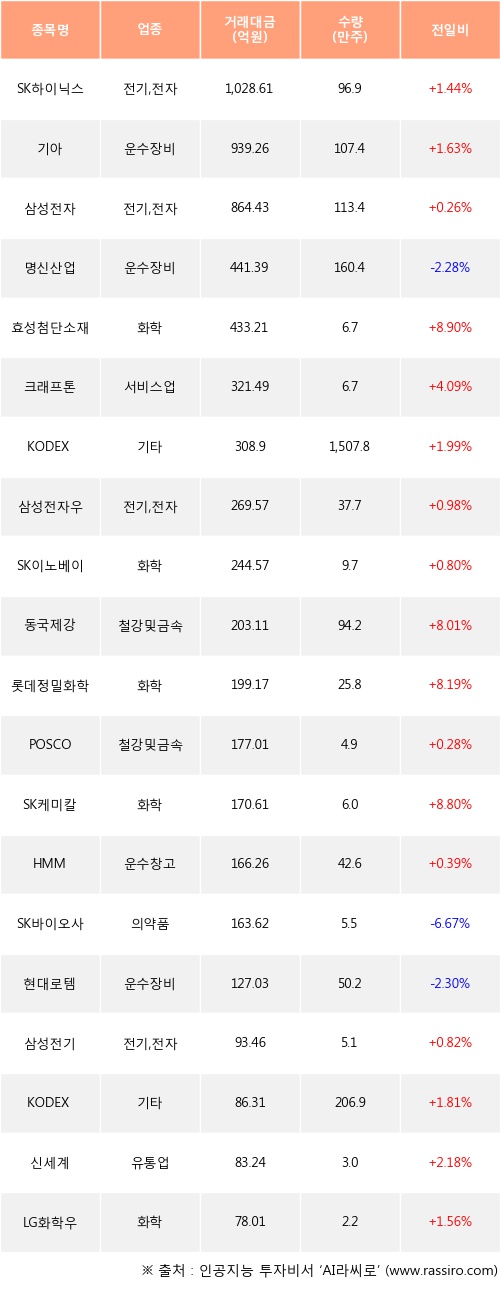 SK하이닉스, 기아, 삼성전자 등은 전일 대비 주가가 상승했고, 명신산업, SK바이오사이언스, 현대로템 등은 주가가 하락했다.