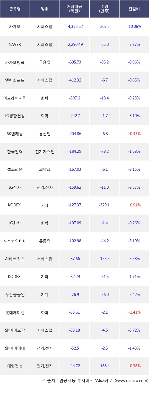 외국인 투자자의 순매도 상위 20개 종목은 카카오, NAVER, 카카오뱅크, 엔씨소프트, 아모레퍼시픽, LG생활건강, SK텔레콤, 한국전력, 셀트리온, LG전자등이다.