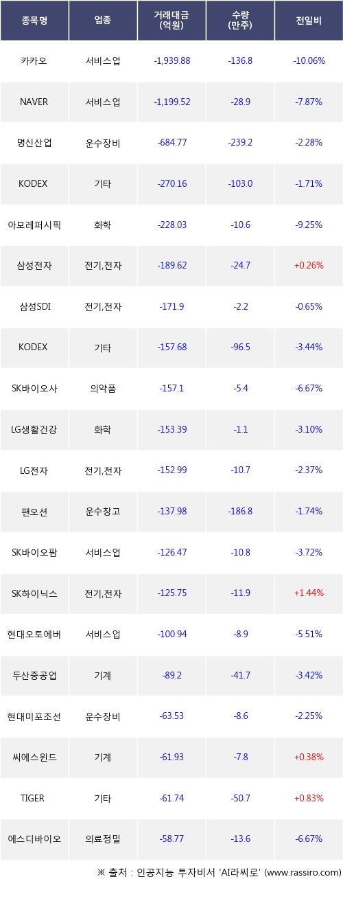 기관 투자자의 순매도 상위 20개 종목은 카카오, NAVER, 명신산업, KODEX 레버리지, 아모레퍼시픽, 삼성전자, 삼성SDI, KODEX 코스닥150 레버리지, SK바이오사이언스, LG생활건강등이다.