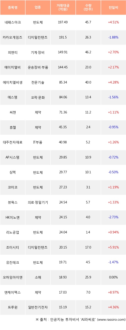 외국인 투자자의 순매수 상위 20개 종목은 네패스아크, 카카오게임즈, 피엔티, 에이치엘비, 에이치엘비생명과학, 에스엠, 씨젠, 휴젤, 대주전자재료, AP시스템등이다.