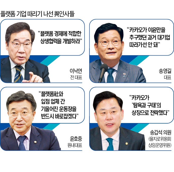 민주당은 이후 플랫폼 기업의 자체 노력을 암묵적으로 요구했다. 하지만 구체적인 반응이 없었던 데다 카카오 등 플랫폼 기업의 문어발식 확장이 논란이 되면서 플랫폼 기업에 대한 여당의 비판이 고조됐다. 송갑석 민주당 의원은 지난 7일 국회 토론회에서 “카카오가 ‘탐욕과 구태’의 상징으로 전락했다”고 원색적인 비난을 했다.
