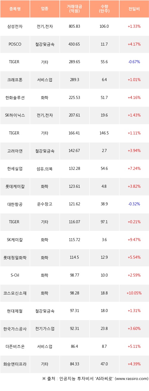 삼성전자, POSCO, 크래프톤 등은 전일 대비 주가가 상승했고, TIGER 미국S&P500선물(H), 대한항공 등은 주가가 하락했다.