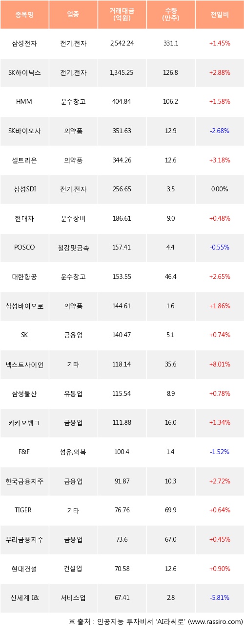 삼성전자, SK하이닉스, HMM 등은 전일 대비 주가가 상승했고, SK바이오사이언스, POSCO, F&F 등은 주가가 하락했다.