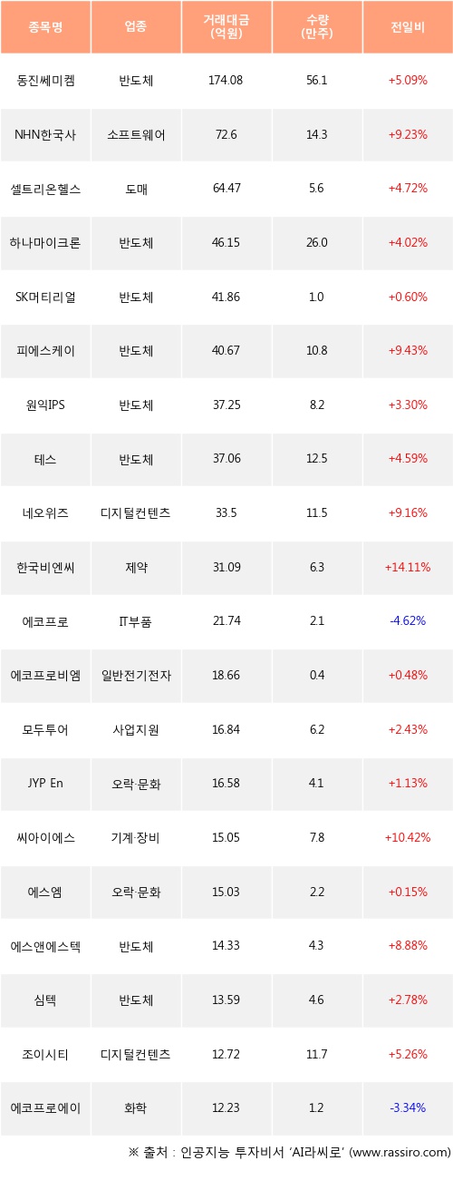 동진쎄미켐, NHN한국사이버결제, 셀트리온헬스케어 등은 전일 대비 주가가 상승했고, 에코프로, 에코프로에이치엔 등은 주가가 하락했다.