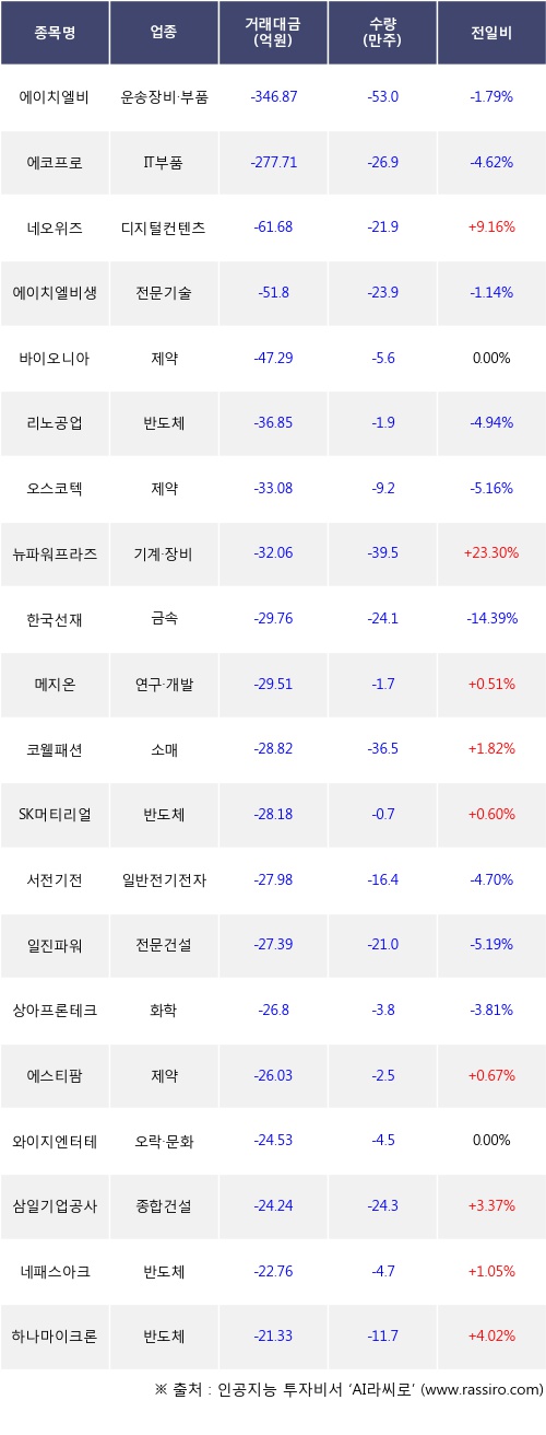 외국인 투자자의 순매도 상위 20개 종목은 에이치엘비, 에코프로, 네오위즈, 에이치엘비생명과학, 바이오니아, 리노공업, 오스코텍, 뉴파워프라즈마, 한국선재, 메지온등이다.