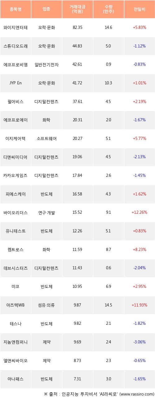 와이지엔터테인먼트, JYP Ent., 펄어비스 등은 전일 대비 주가가 상승했고, 스튜디오드래곤, 에코프로비엠, 에코프로에이치엔 등은 주가가 하락했다.