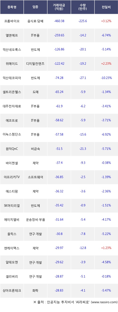기관 투자자의 순매도 상위 20개 종목은 프롬바이오, 엘앤에프, 덕산네오룩스, 위메이드, 덕산테코피아, 셀트리온헬스케어, 대주전자재료, 에코프로, 이녹스첨단소재, 원익QnC등이다.