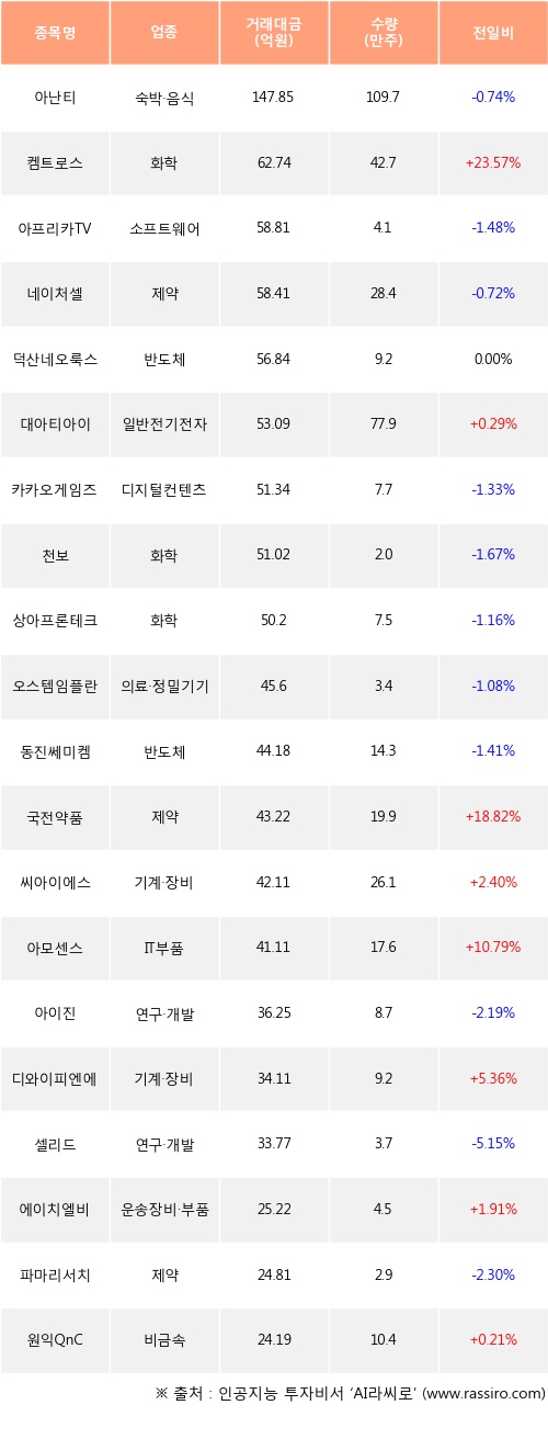 켐트로스, 대아티아이, 국전약품 등은 전일 대비 주가가 상승했고, 아난티, 아프리카TV, 네이처셀 등은 주가가 하락했다.