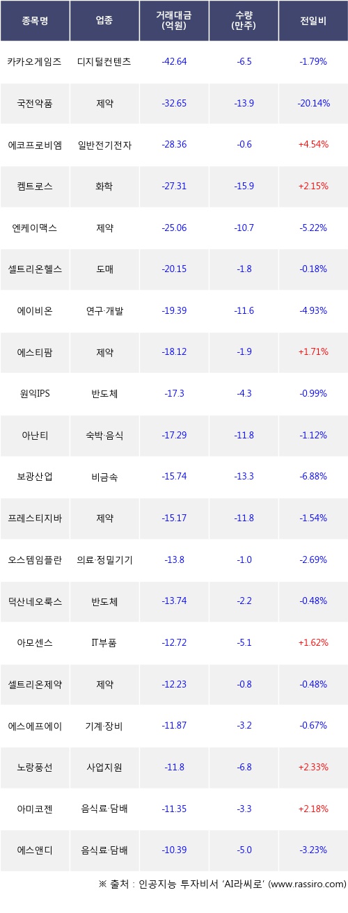 기관 투자자의 순매도 상위 20개 종목은 카카오게임즈, 국전약품, 에코프로비엠, 켐트로스, 엔케이맥스, 셀트리온헬스케어, 에이비온, 에스티팜, 원익IPS, 아난티등이다.