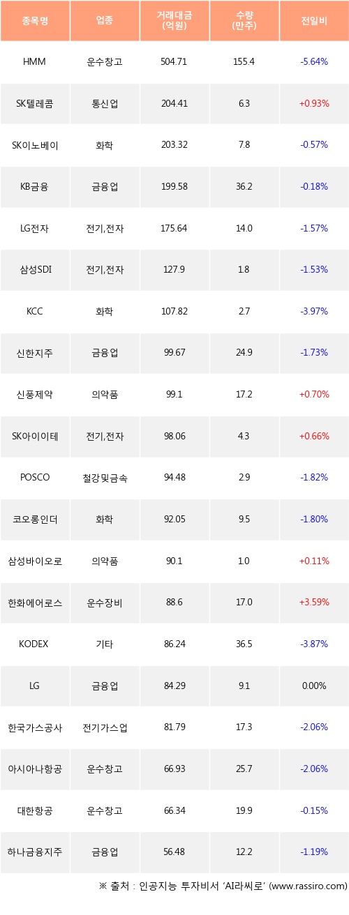 외국인 투자자의 순매수 상위 20개 종목은 HMM, SK텔레콤, SK이노베이션, KB금융, LG전자, 삼성SDI, KCC, 신한지주, 신풍제약, SK아이이테크놀로지등이다.
