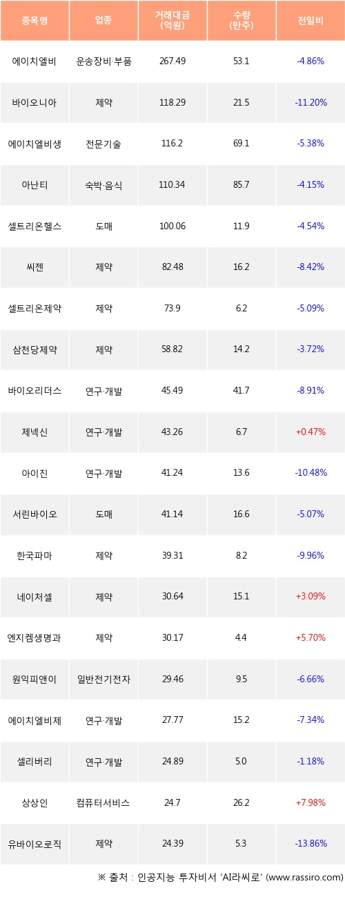 제넥신, 네이처셀, 엔지켐생명과학 등은 전일 대비 주가가 상승했고, 에이치엘비, 바이오니아, 에이치엘비생명과학 등은 주가가 하락했다.