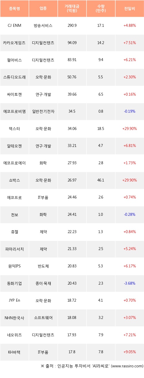 CJ ENM, 카카오게임즈, 펄어비스 등은 전일 대비 주가가 상승했고, 에코프로비엠, 천보, 동화기업 등은 주가가 하락했다.