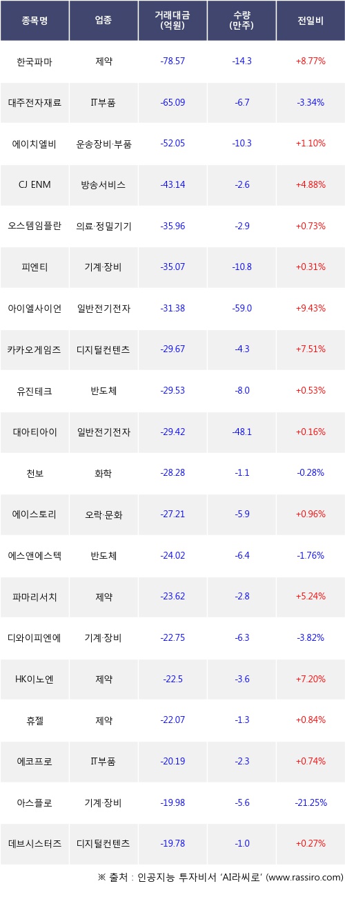 외국인 투자자의 순매도 상위 20개 종목은 한국파마, 대주전자재료, 에이치엘비, CJ ENM, 오스템임플란트, 피엔티, 아이엘사이언스, 카카오게임즈, 유진테크, 대아티아이등이다.