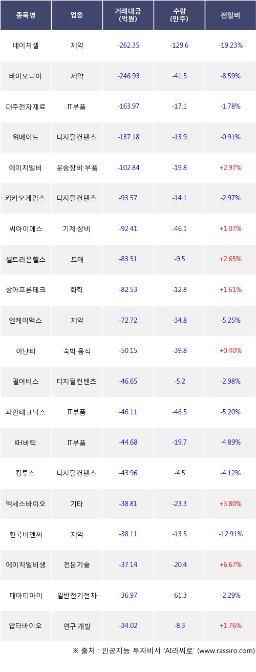 외국인 투자자의 순매도 상위 20개 종목은 네이처셀, 바이오니아, 대주전자재료, 위메이드, 에이치엘비, 카카오게임즈, 씨아이에스, 셀트리온헬스케어, 상아프론테크, 엔케이맥스등이다.