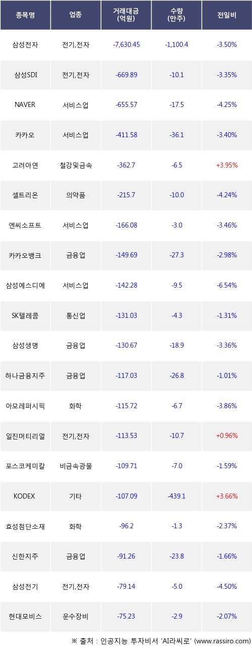외국인 투자자의 순매도 상위 20개 종목은 삼성전자, 삼성SDI, NAVER, 카카오, 고려아연, 셀트리온, 엔씨소프트, 카카오뱅크, 삼성에스디에스, SK텔레콤등이다.